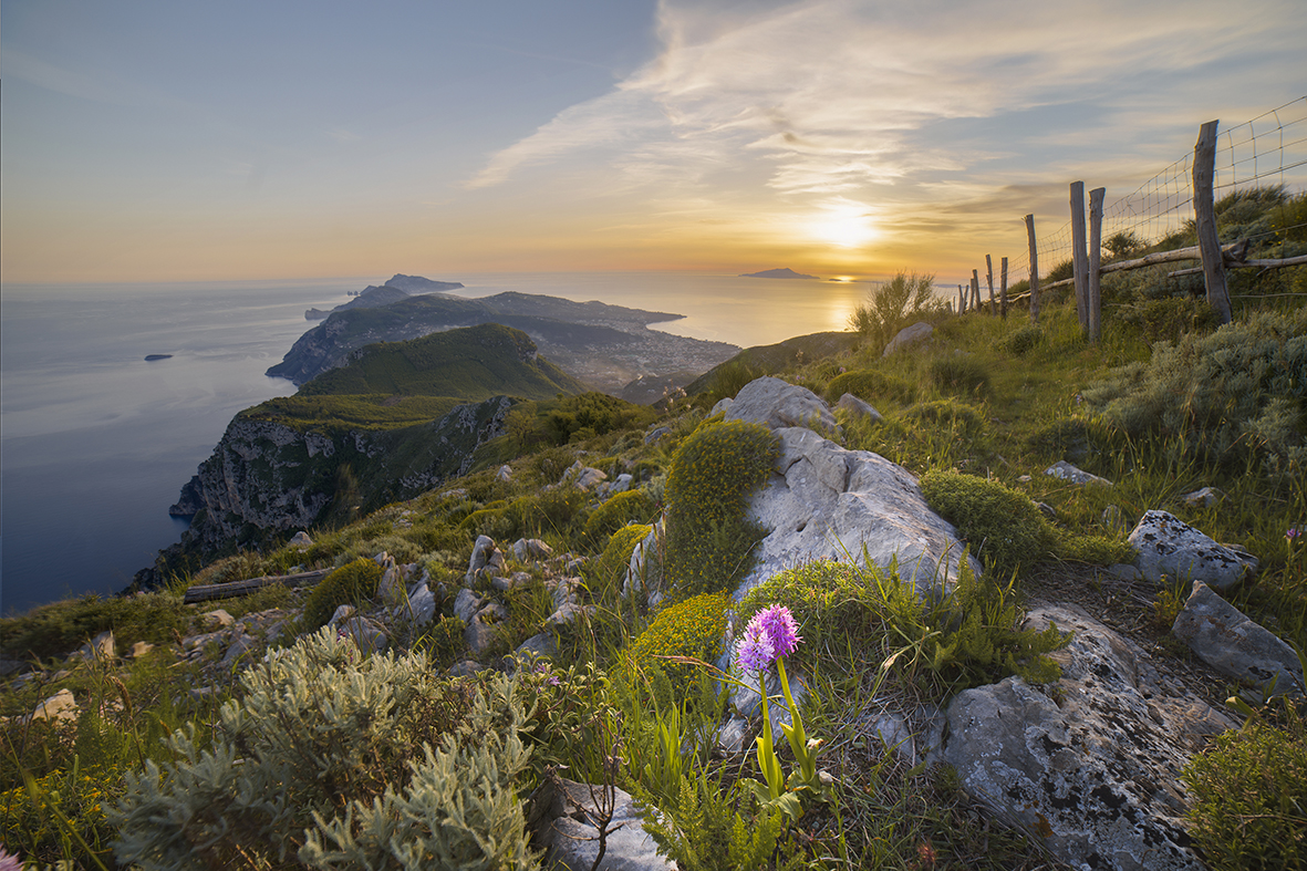 Viola tenue come quello delle orchidee che nascono spontanee ai bordi dei sentieri sul Monte Comune e regnano su una vista mozzafiato che domina tutta la penisola Sorrentina,