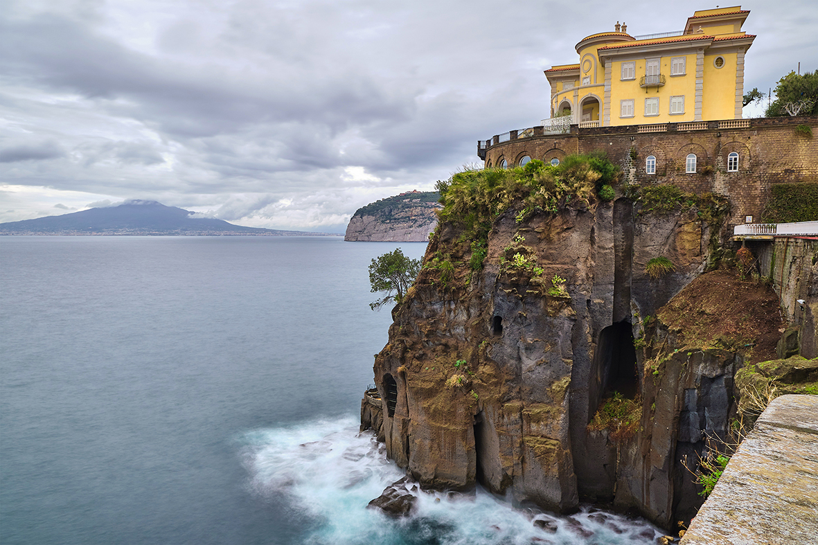 Nel grigio di una giornata nuvolosa di novembre, il giallo di Villa Nicolini a Sant’Agnello risalta dalla sua posizione dominante, come in questa foto di Giuseppe Aversa.