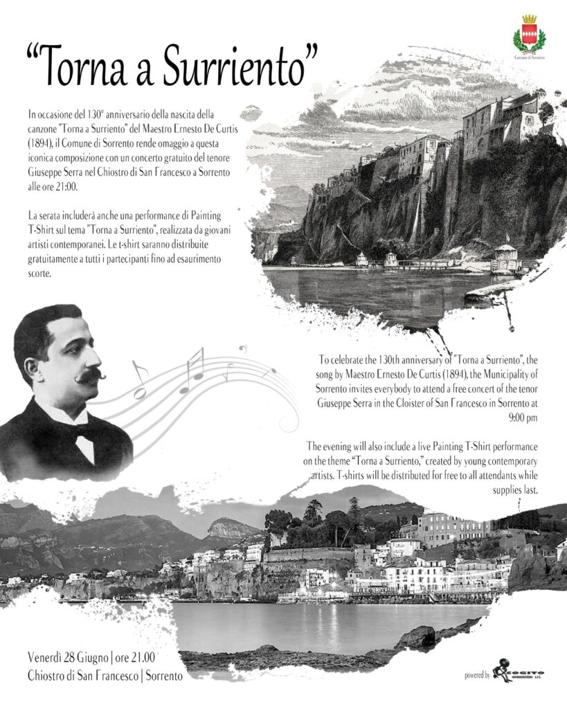 Per i 130 anni della nascita dell’iconica canzone “Torna a Surriento“, che ha reso Sorrento celebre in tutto il mondo, il Comune organizza un concerto omaggio al suo compositore, il M. Ernesto De Curtis.