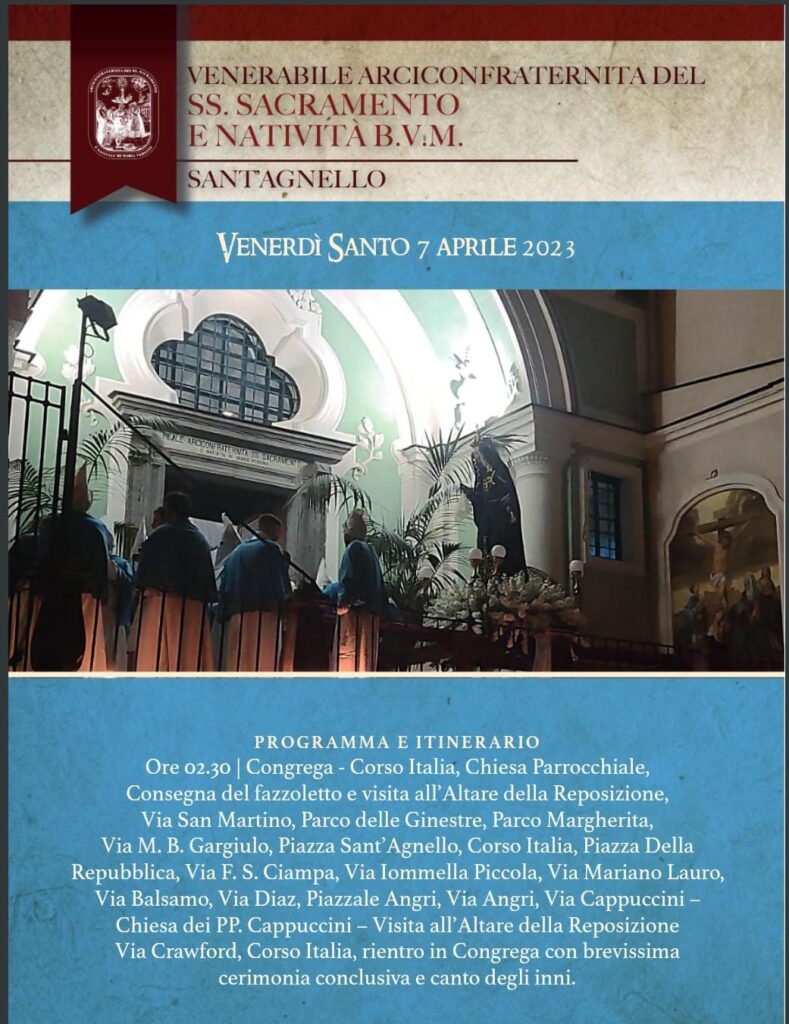 Percorso: Congrega-Corso Italia, Chiesa Parrocchiale, (Consegna del fazzoletto e Altare della Reposizione), Via San Martino, Parco delle Ginestre, Parco Margherita, Via M.B. Gargiulo, Piazza Sant’Agnello, Corso Italia, Piazza della Repubblica, Via F.S. Ciampa, Via Iommella Piccola, Via M. Lauro, Via Balsamo, Via Diaz, Piazzale Angri, Via Angri, Via Cappuccini, Chiesa dei PP. Cappuccini (Altare della Reposizione), Via Crawford, Corso Italia, rientro in Congrega, cerimonia di rientro e canto degli inni.