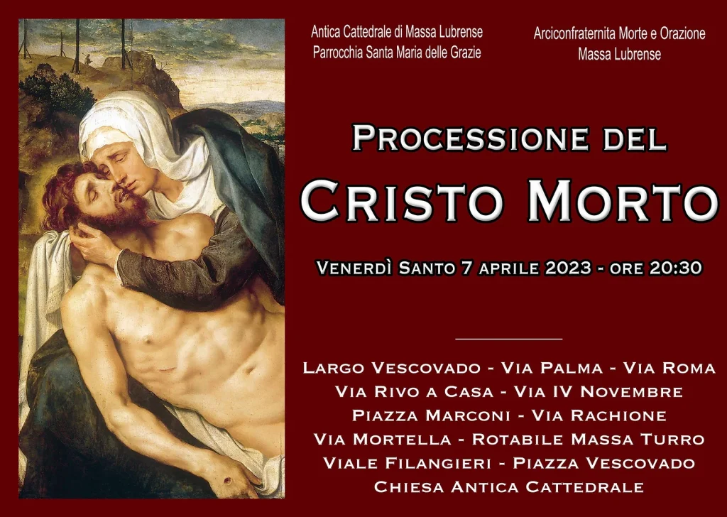 ore 20:00 Largo San Michele: incontro delle statue del Cristo Morto e della Madonna Addolorata – Via F. Ciampa, Via M. Maresca, Via delle Rose, Via Ripa di Cassano, Via Madonna di Rosella, Via Bagnulo, II trav. Bagnulo, Trav. Gottola, Via F. Ciampa, Via S. Michele, Via Stazione, Via dei Tigli, Via Casa Rosa, Via Bagnulo, Via dei Pini, Corso Italia, Piazza della Repubblica, Via Mercato, Via delle Rose, Via Carlo Amalfi, Basilica di S. Michele Arcangelo, cerimonia di rientro della processione.