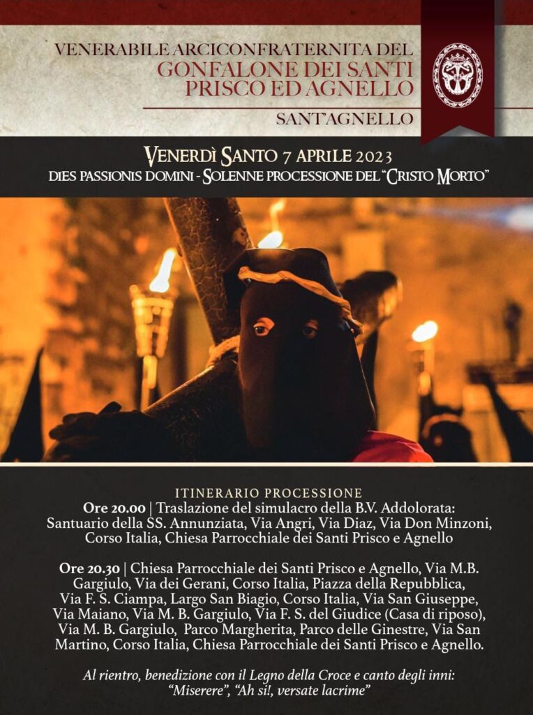 Percorso: ore 20:00 – Traslazione del simulacro dell’Addolorata: Santuario della SS. Annunziata, Via Angri, Via Diaz, Via Don Minzoni, Corso Italia, Chiesa Parrocchiale dei SS. Prisco e Agnello; ore 20:30: Chiesa Parrocchiale, Via M.B. Gargiulo, Via dei Gerani, Corso Italia, Piazza della Repubblica, Via F. S. Ciampa, Largo San Biagio, Corso Italia, Via S. Giuseppe, Via Maiano, Via M.B.Gargiulo, Via F. S. Del Giudice (casa di riposo), Via M.B. Gargiulo, Parco Margherita, Parco delle Ginestre, Via San Martino, Corso Italia, Chiesa Parrocchiale, cerimonia di rientro e canto degli inni.