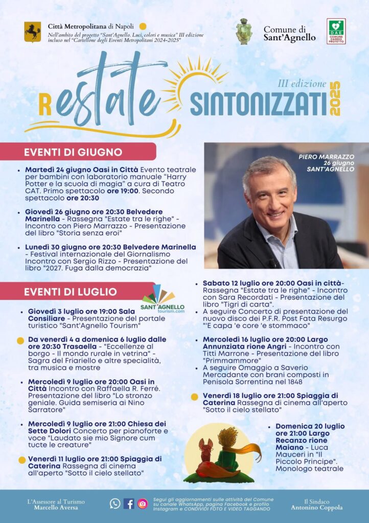 Restate Sintonizzati 2025 a Sant’Agnelloè il calendario ricco di appuntamenti che intratterrà cittadini e visitatori dal 24 Giugnofino al 29 Agosto.